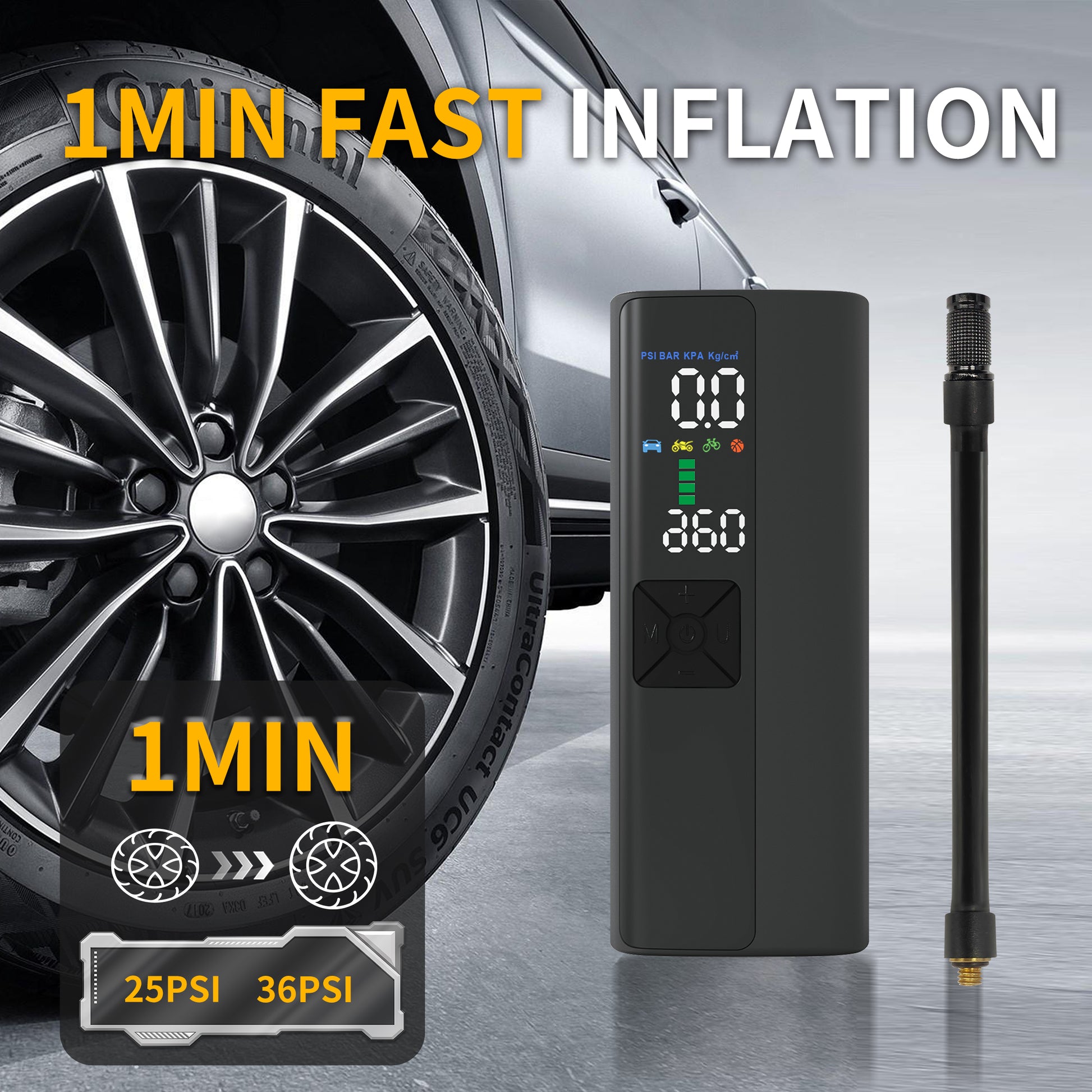 This product can be used for most car tires, motorcycles, go-karts, bicycles, basketballs, UTVs, golf carts, etc. Its rated pressure is up to 150 PSI and is equipped with all the accessories needed to inflate without trouble.