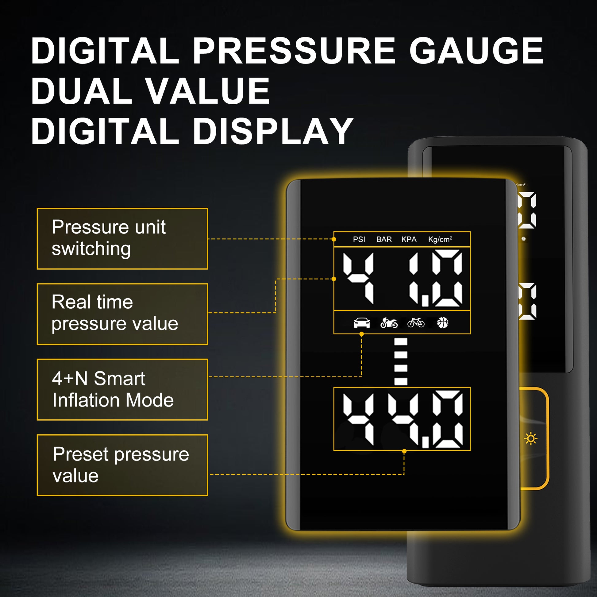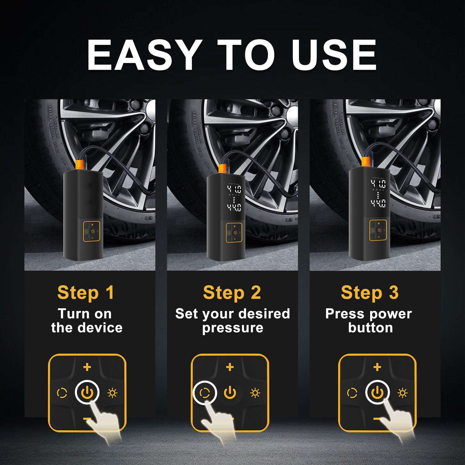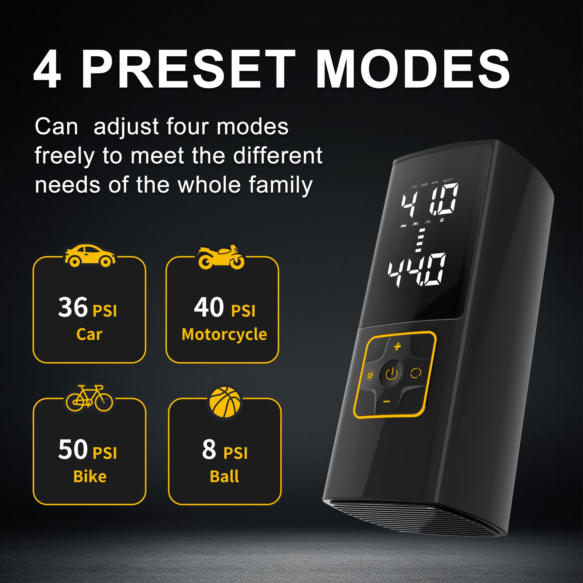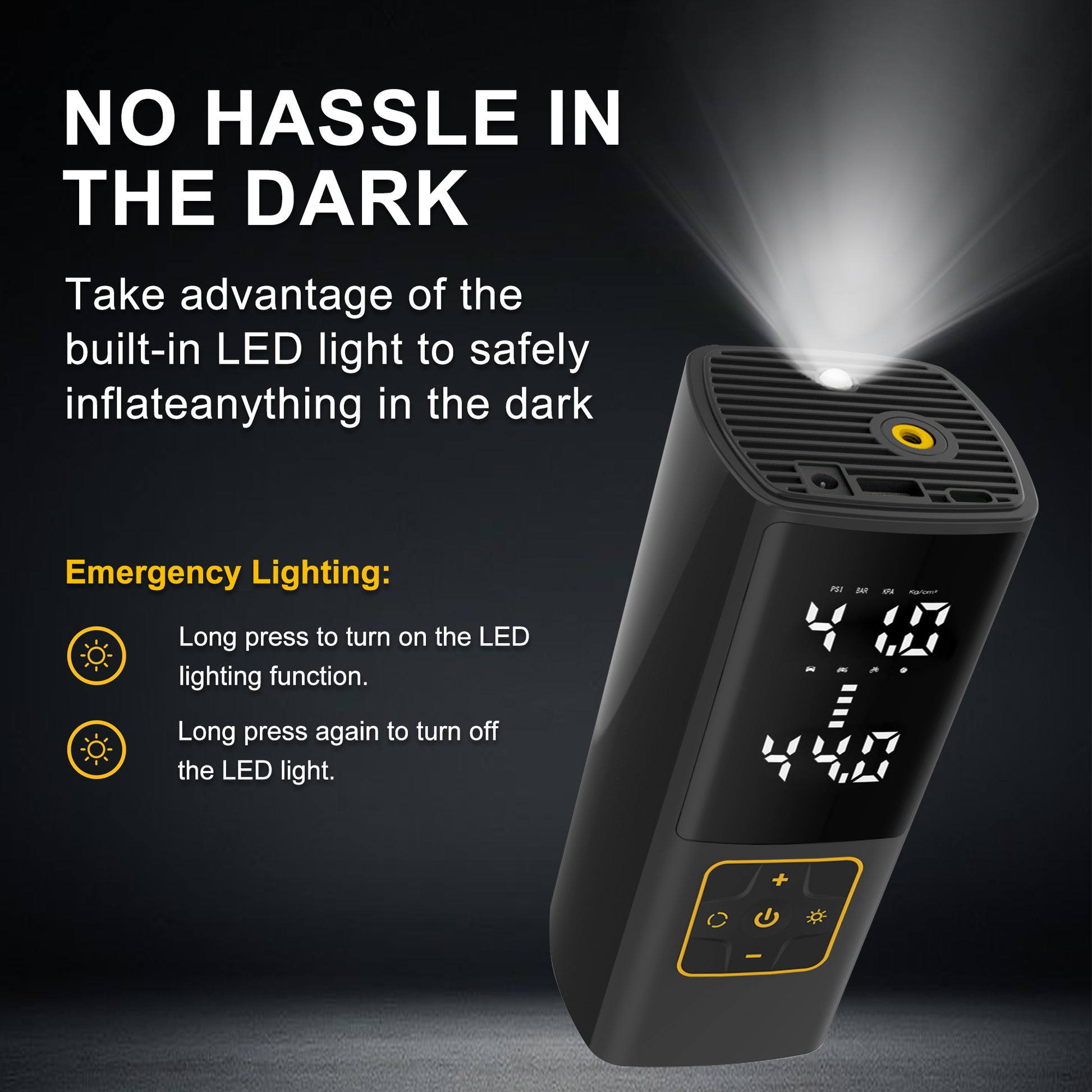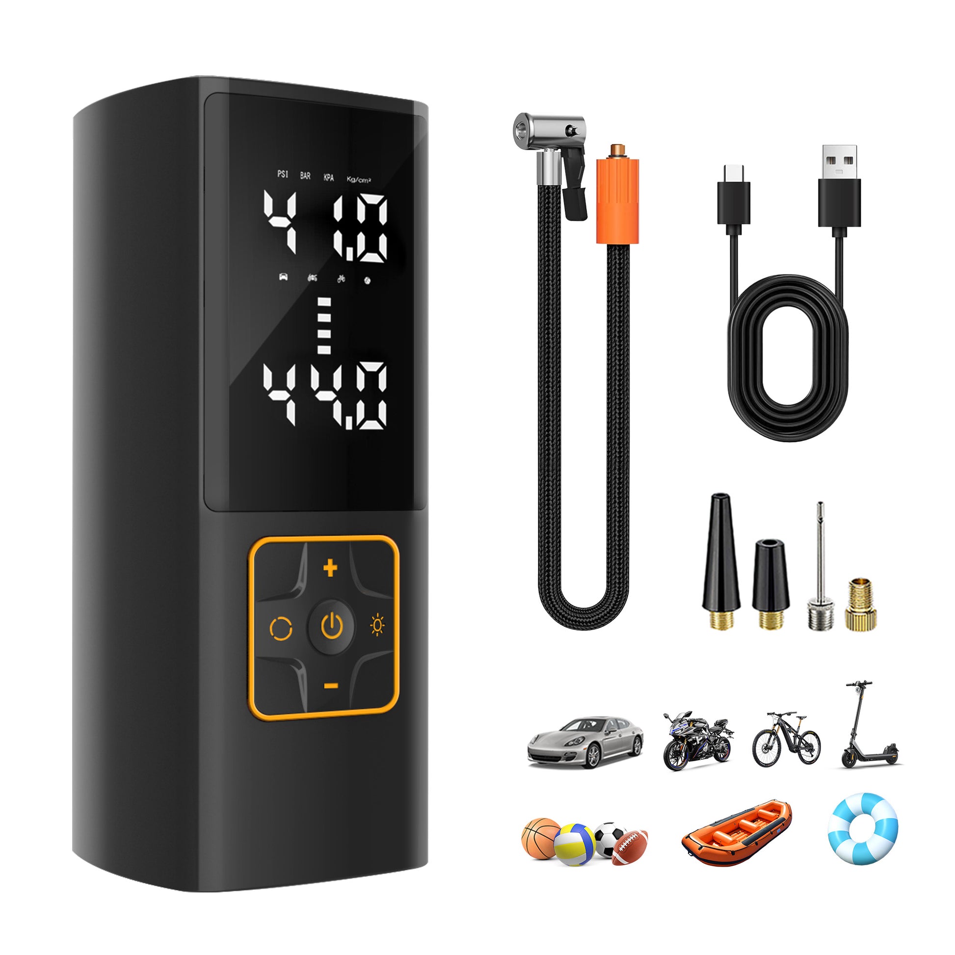 The IOVELOMENT P044 Portable Tire Inflator is a compact, cordless air pump delivering up to 150 PSI for fast inflation of car, motorcycle, bike tires, and sports balls. Featuring a digital pressure gauge with auto shut-off, USB-C rechargeable battery, and a USB-C power bank, it ensures precision and convenience on the go. With a bright LED light, multiple nozzle attachments, and a durable, lightweight design, this mini tire inflator is perfect for emergencies, travel, and everyday use. The P044 is your all-in-one portable inflator kit for reliable, hassle-free inflation anywhere.