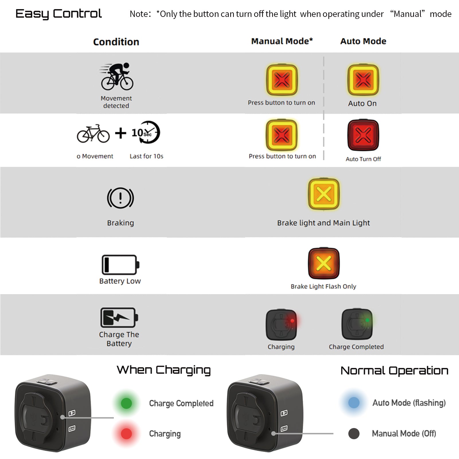 The light automatically adjusts between daytime visibility mode and night mode by detecting ambient light. It also features auto/manual standby when no motion is detected for 10 seconds, saving battery power. -