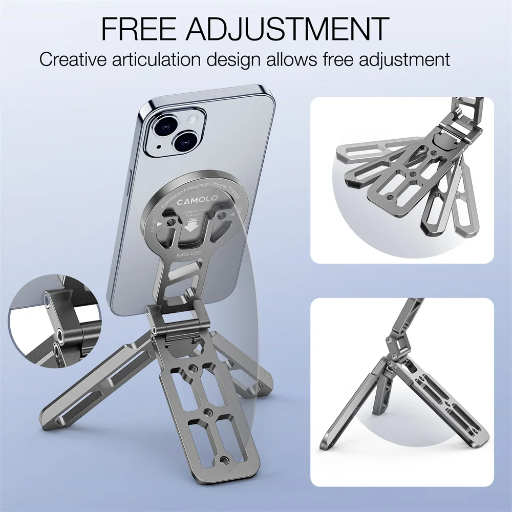 【Compact And Portable】This magnetic phone tripod is foldable and allows you to travel on the go, just fold it and put it into your backpack, it can bring you great convenience, takes up no space at all, and can be folded repeatedly without loose.